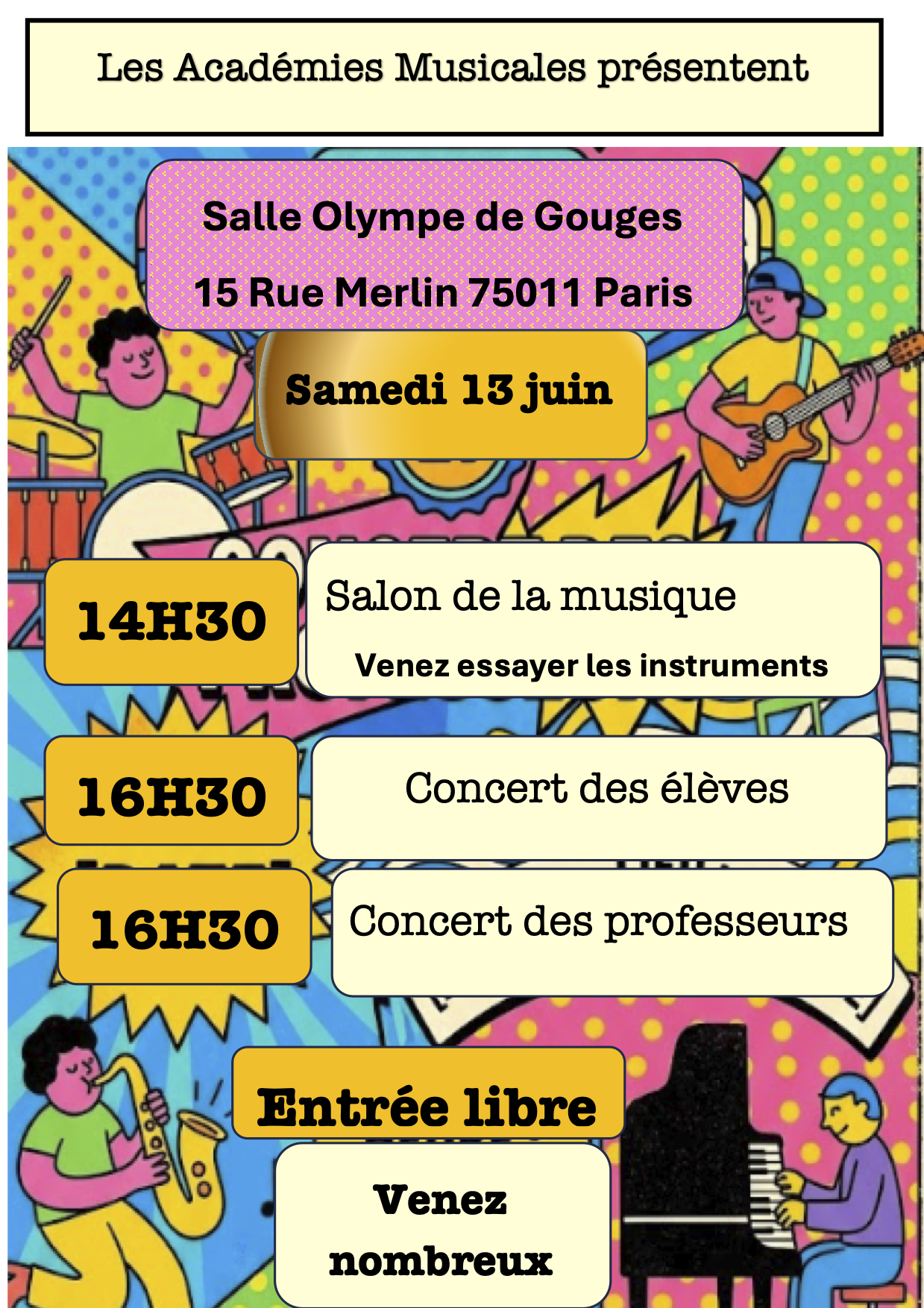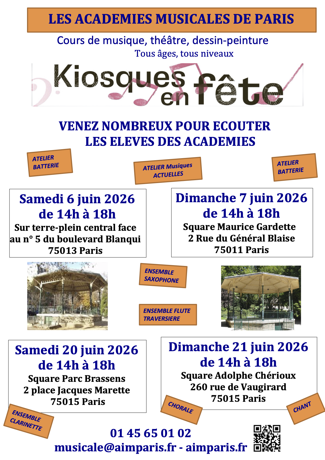 Des cours, des ateliers : guitare, piano, saxo, violon, accordéon, flûte,solfège, dessin, peinture, marrionnettes, théâtre à l'Académie Inter Musicale de Paris AIMP et dans les Académies Musicales des 5ème Monge, 11ème Bastille ou Voltaire, 13ème Italie ou Glacière, 14ème Plaisance et 15ème Convention ou Lourmel.