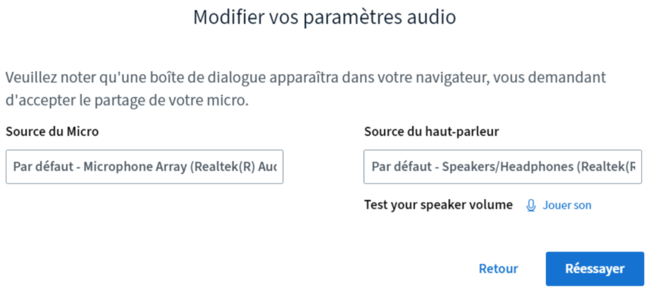 Si vous envisagez de participer aux discussions, cliquez sur « Microphone ». La fenêtre affiche « Connexion au test d’écho... », qui peut perdurer quelques secondes. Vous verrez ensuite cette fenêtre :