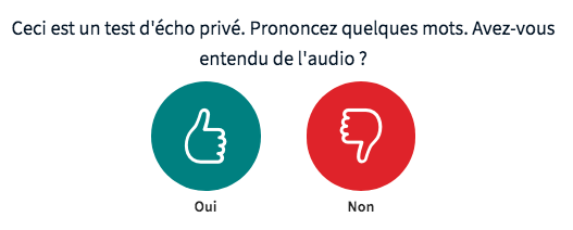 Prononcez quelques mots. Si vous avez des écouteurs ou un casque, vous devez entendre les mêmes mots dans les écouteurs. Si vous n’en avez pas, vous devez entendre les mots avec le haut-parleur de votre ordinateur/smartphone/tablette. Cliquez sur « Oui ». Si vous n’entendez rien, c’est que votre micro est mal configuré. Cliquez sur « Non », vous obtiendrez ce type de fenêtre :